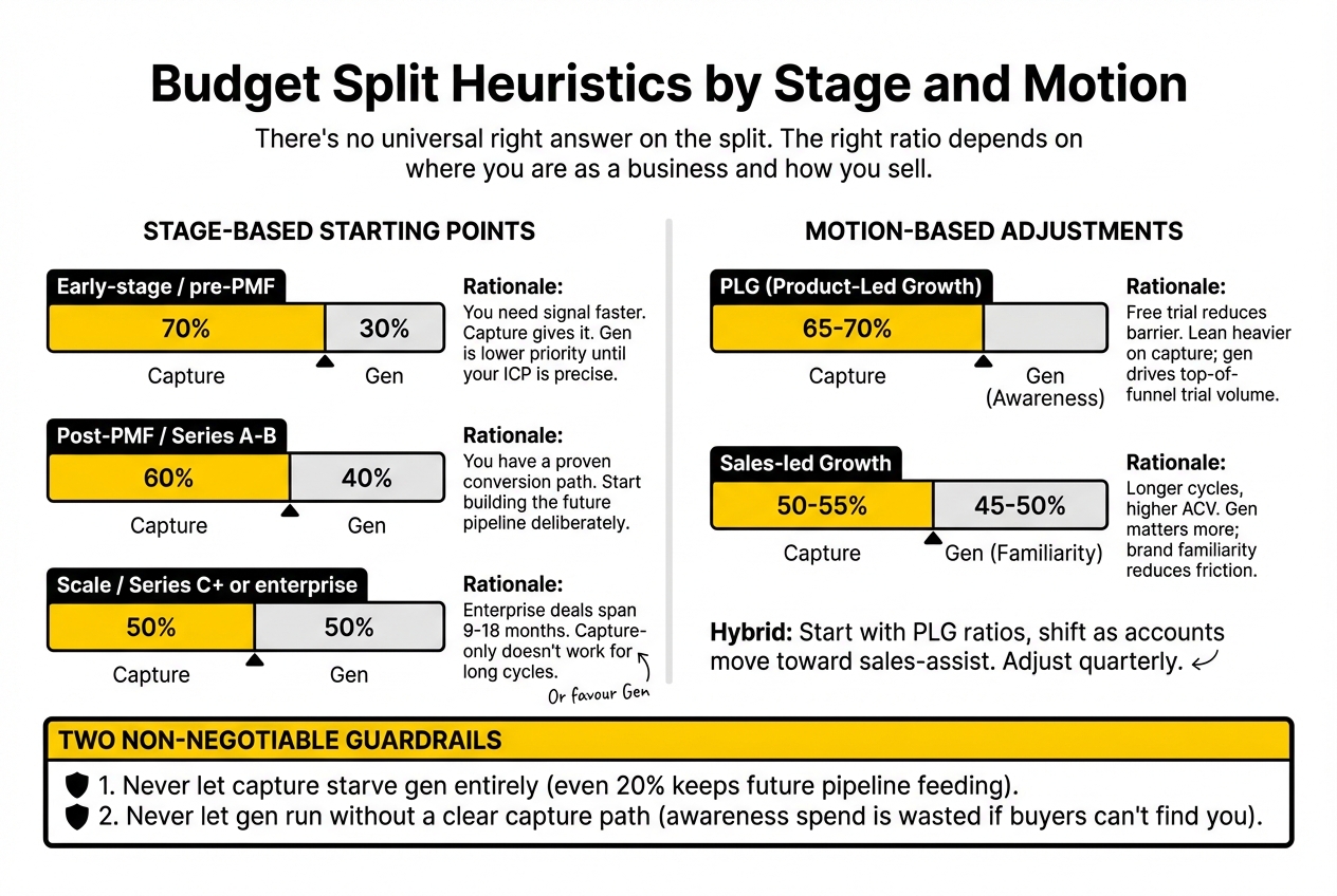 Two guardrails that apply regardless of stage: never let capture starve gen entirely (even a 20% gen allocation keeps the future pipeline feeding), and never let gen run without a clear capture path. If buyers can't find you when they eventually search, the awareness spend is wasted.