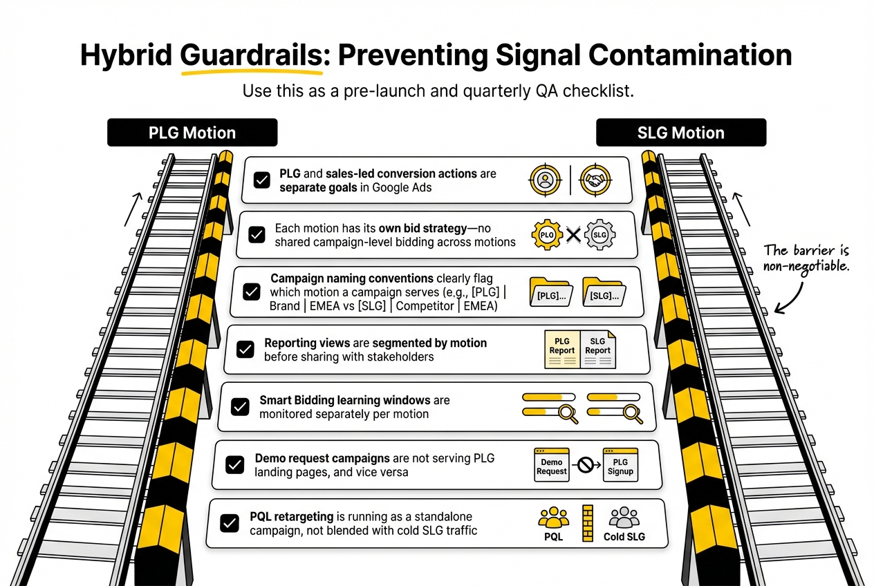 In a hybrid motion, some PLG users eventually reach product-qualified lead (PQL) status and should enter a sales conversation. From a campaign structure perspective: don't mix PQL retargeting with cold demo-request campaigns. Retargeting users who have already completed a trial with a "Talk to Sales" message is a legitimate tactic—but run it as a standalone campaign with separate budget, messaging, and conversion tracking. If it blends into your cold SLG traffic, the conversion data becomes meaningless.