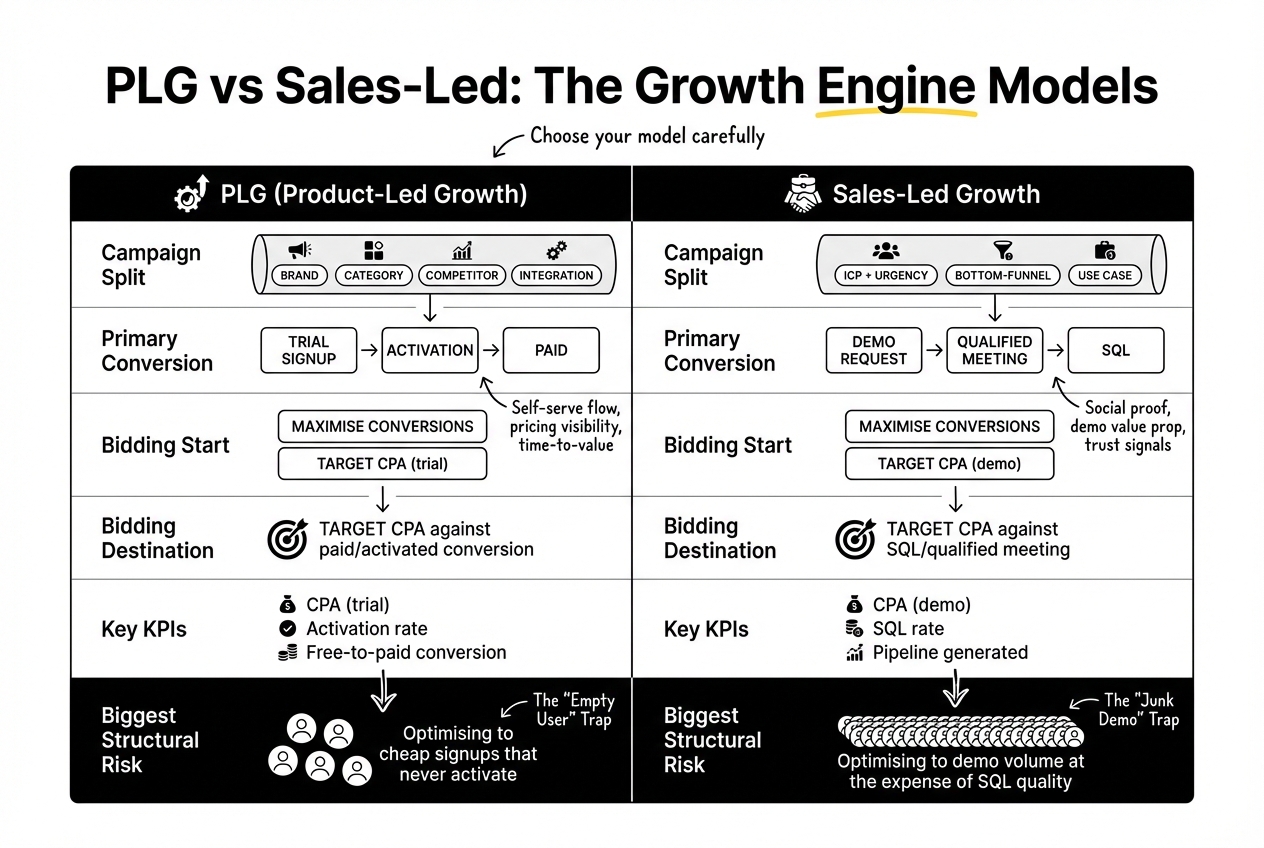 PLGSales-LedCampaign splitIntent type (brand, category, competitor, integration)ICP + urgency (bottom-funnel, use case, competitor)Primary conversionTrial signup → Activation → PaidDemo request → Qualified meeting → SQLBidding startMaximise Conversions → Target CPA (trial)Maximise Conversions → Target CPA (demo)Bidding destinationTarget CPA against paid/activated conversionTarget CPA against SQL/qualified meetingLanding page focusSelf-serve flow, pricing visibility, time-to-valueSocial proof, demo value prop, trust signalsKey KPIsCPA (trial), activation rate, free-to-paid conversionCPA (demo), SQL rate, pipeline generatedBiggest structural riskOptimising to cheap signups that never activateOptimising to demo volume at the expense of SQL quality