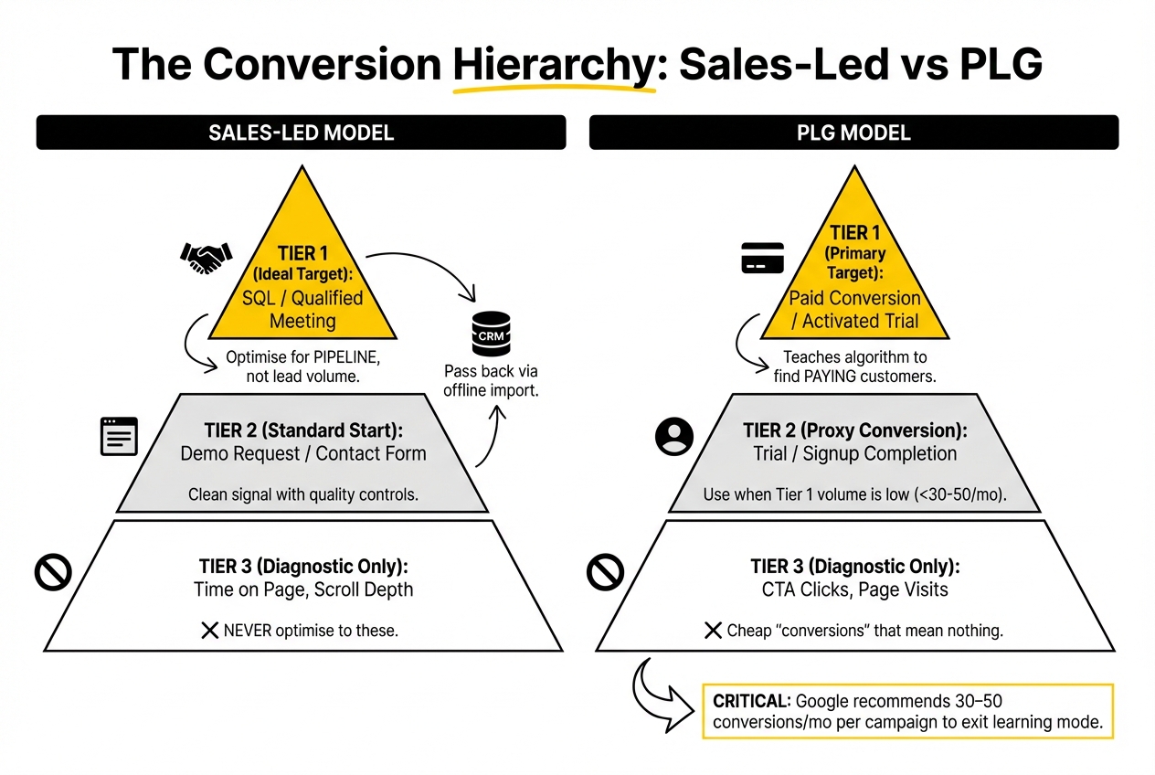 This is the most important structural decision in a PLG account. You need a hierarchy of conversion events, and you need to be deliberate about which one Smart Bidding is actually targeting.