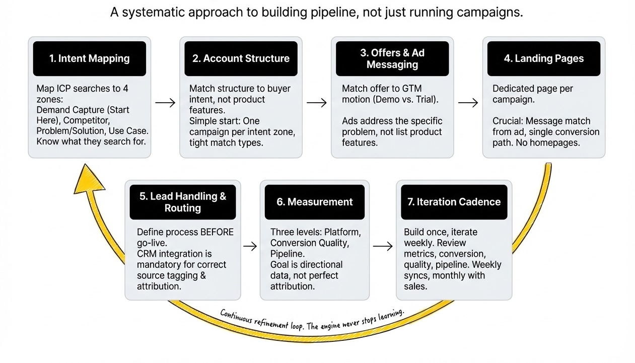 Days 1–30: Foundation. Confirm ICP and define the demand capture keyword list. Set up conversion tracking with CRM integration and UTM parameters standardised across all campaigns. Build one demand capture campaign with 2–3 tight ad groups. Build a dedicated landing page for the primary offer. Define the lead routing process with sales. Establish the weekly reporting cadence. The goal at 30 days is not volume — it's a clean, measurable baseline where every lead is traceable from keyword to CRM record.