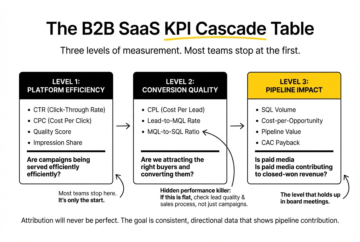 The measurement system for a SaaS PPC engine operates across three levels. Each level answers a different question.