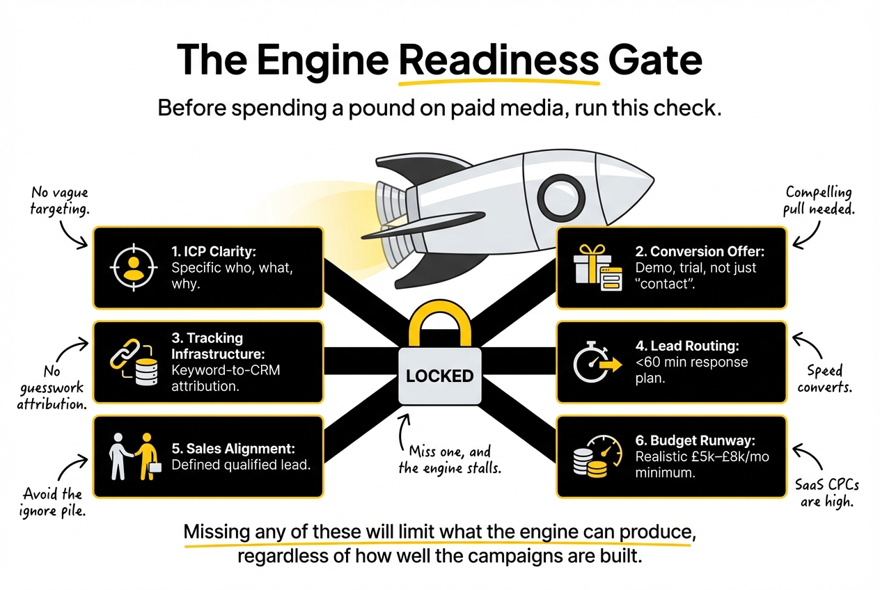 Before spending a pound on paid media, run this check. Missing any of these will limit what the engine can produce, regardless of how well the campaigns are built.