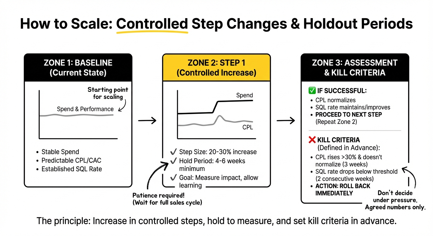 - Kill criteria: Define in advance what a failed step looks like. If CPL rises more than 30% and doesn’t normalise within three weeks, or if SQL rate drops below your threshold for two consecutive weeks, you roll back. These should be numbers agreed before the budget goes up, not interpretations made under pressure after it has.