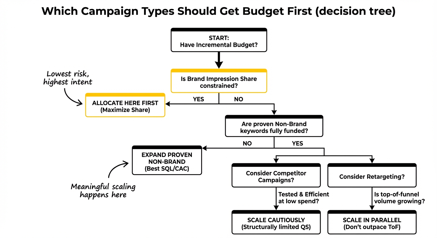 Brand campaigns first if impression share is being lost to budget. Then proven non-brand demand capture segments, deepening into keyword sets and audiences with the best existing SQL and CAC data. Competitor campaigns and new keyword territory come later, once the core is consolidated, and should be budgeted separately with distinct test parameters.
